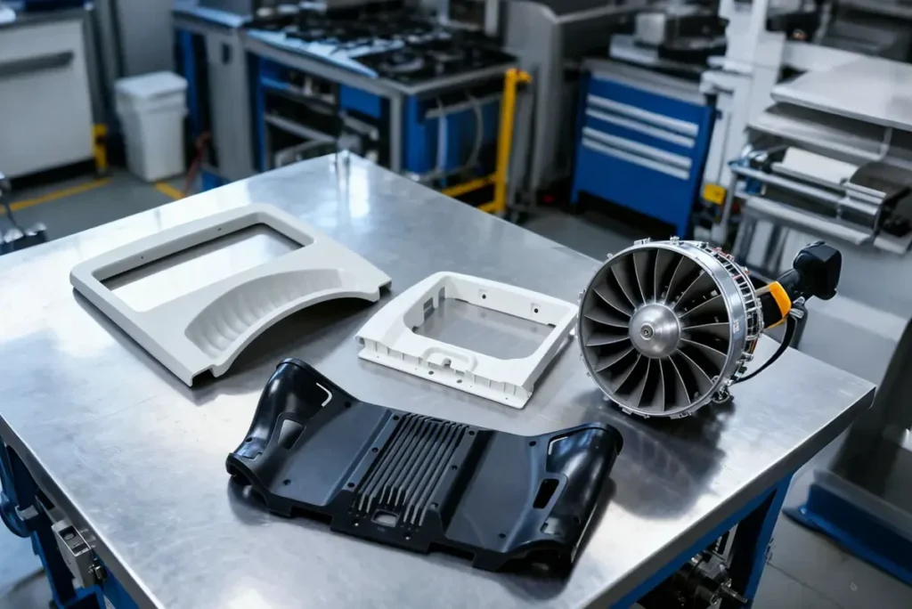 Aerospace parts, like auxiliary & interior components, small-scale structural & enclosure parts and tooling, fixtures & prototypes